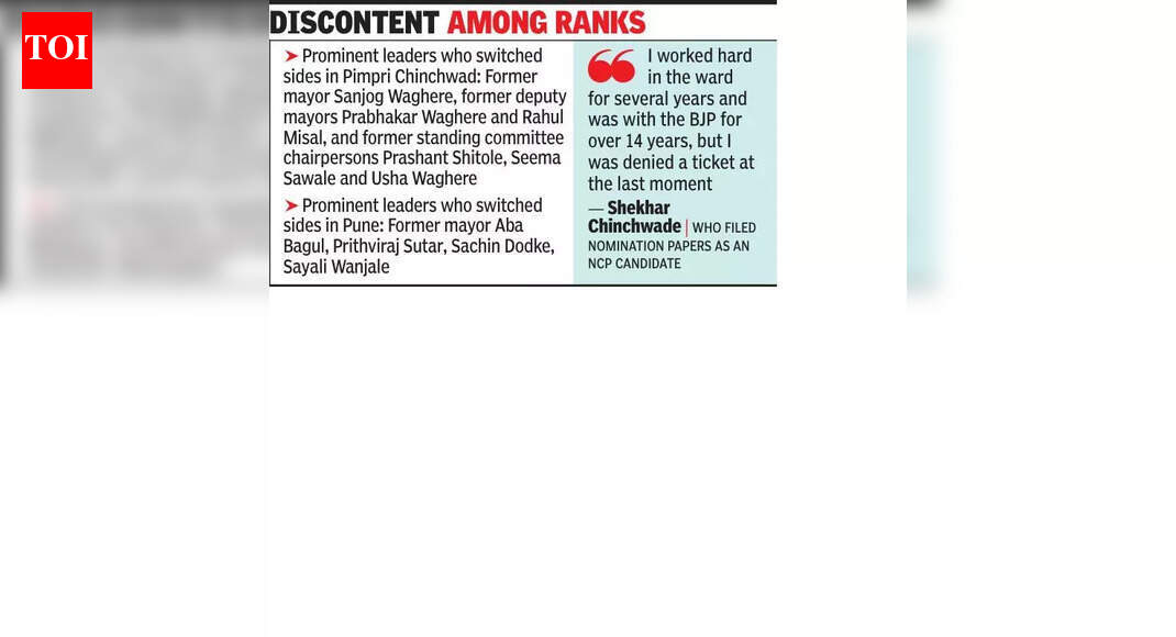 पुणे : पुणे आणि पिंपरी चिंचवडमधील भाजप आणि राष्ट्रवादीच्या अनेक कार्यकर्त्यांना आगामी महापालिका निवडणुकीसाठी प्रतिस्पर्धी पक्षांकडून उमेदवारी नाकारण्यात आली आहे.अनेक माजी नगरसेवक आणि आशावादी पक्ष बदलून किंवा अपक्ष म्हणून निवडणूक लढविल्याने या निर्णयामुळे व्यापक असंतोष निर्माण झाला आहे.नाकारलेल्या तिकीटांमध्ये 2017 च्या नागरी निवडणुकीत उपविजेते राहिलेले अनेक माजी नगरसेवक आणि उमेदवार आहेत.पिंपरी चिंचवडमध्ये अलीकडच्या काळात किमान २० माजी नगरसेवक आणि इतर पक्षांतील इच्छुकांनी भाजपमध्ये प्रवेश केला, तर आठ ते दहा जणांनी राष्ट्रवादीत प्रवेश केला. या प्रवेशांचा अंदाज आहे की जवळपास 25 स्थानिक पक्ष कार्यकर्त्यांच्या संभाव्यतेवर परिणाम झाला आहे ज्यांनी आधीच निवडणुकीची तयारी सुरू केली होती. राष्ट्रवादीच्या महिला शहराध्यक्षा कविता आल्हाट आणि माजी आमदार विलास लांडे यांचे पुत्र विक्रांत लांडे यांचा तिकीट नाकारण्यात आलेल्यांमध्ये समावेश आहे.पिंपरी चिंचवडमध्ये माजी महापौर संजोग वाघेरे, माजी उपमहापौर प्रभाकर वाघेरे आणि राहुल मिसाळ आणि माजी स्थायी समिती सभापती प्रशांत शितोळे, सीमा सावळे आणि उषा वाघेरे यांच्यासह अनेक प्रमुख नेत्यांनी बाजू बदलली.असाच कल पुणे महानगरपालिका (पीएमसी) हद्दीत दिसला, जेथे कोथरूडसारख्या पारंपारिक बालेकिल्ल्यातही भाजपने पक्ष निष्ठावंतांपेक्षा नवीन प्रवेशांना प्राधान्य दिले. शिवसेनेचे (UBT) पृथ्वीराज सुतार यांनी भाजपमध्ये प्रवेश केला आणि पक्ष बदलल्यानंतर काही दिवसांतच त्यांना तिकीट मिळाले. राष्ट्रवादी काँग्रेसचे माजी नगरसेवक सचिन दोडके आणि सायली वांजळे, जे शरद पवार यांच्या राष्ट्रवादी काँग्रेसमध्ये फूट पडल्यानंतरही भाजपमध्ये दाखल झाले आणि त्यांना वारजे परिसरातून उमेदवारी देण्यात आली. दरम्यान, माजी उपमहापौर आणि काँग्रेसचे ज्येष्ठ नगरसेवक उल्हास (आबा) बागुल हे नुकतेच पक्षात दाखल झाल्यानंतर शिवसेनेच्या तिकिटावर सहकारनगरमधून निवडणूक लढवत आहेत.अपेक्षित बंडखोरी टाळण्यासाठी, पक्षांनी उमेदवारी अंतिम मुदतीपर्यंत अधिकृत उमेदवार याद्या जाहीर करण्यास विलंब केला. पिंपरी चिंचवडमध्ये भाजपचे एबी फॉर्म उमेदवारांच्या हाती न देता थेट अंतिम मुदतीच्या दोन तास आधी निवडणूक कार्यालयात जमा करण्यात आले.2017 च्या निवडणुकीत उपविजेते ठरलेल्या आणि यावेळी त्यांना तिकीट नाकारण्यात आलेल्या इच्छुकांची संख्या अधिक होती, कारण याआधी त्यांना पराभूत केलेल्या उमेदवारांना मोठ्या प्रमाणात प्रवेश मिळाल्याने त्यांच्या संधींना धक्का बसला.2017 च्या PMC निवडणुकीत निवडून आलेले जवळपास 30 नगरसेवक यावेळी तिकीट मिळवू शकले नाहीत. पक्षाच्या नेत्य
